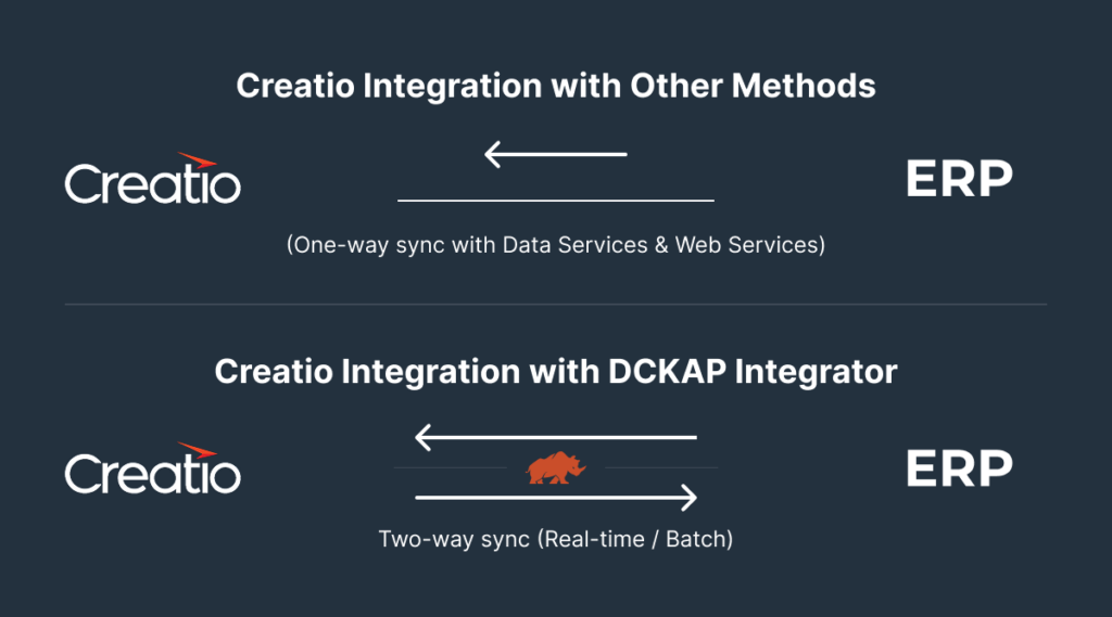 DCKAP Integrator follows this ERP-first model, making it easier to integrate Creatio with ERP systems and extend those integrations to other tools as the business grows.