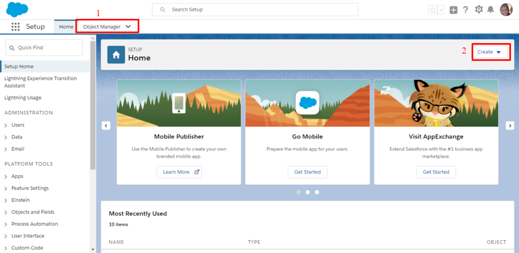 First, you must click the ‘Object Manager’ button on the home page at the top left side. The object manager page will be opened within the same page, where you can then click the ‘Create’ button on the top right side to open the custom object. In that new page, you can fill out the label name for the custom object called “Student”, and then you can click the ‘Save’ button to save the custom object.