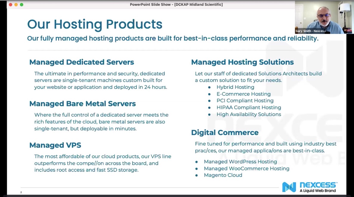 Gary Smith, Strategic Partner Development Manager at Nexcess, was able to provide some insight in the hosting needs of Midland Scientific. He spoke on how they have been able to successfully manage performance and security, as well as some of the available features and the many advantages of their managed hosting solutions.
