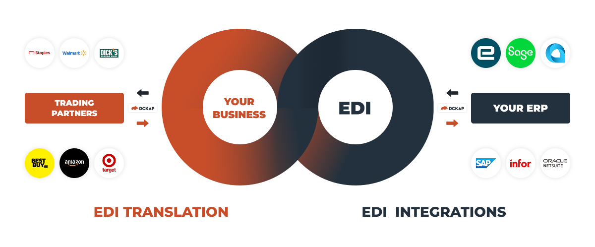 DCKAP EDI integrates directly with the leading ERP systems—including Epicor, SAP, Acumatica, NetSuite, Infor, Microsoft Dynamics, Sage, and homegrown ERPs.